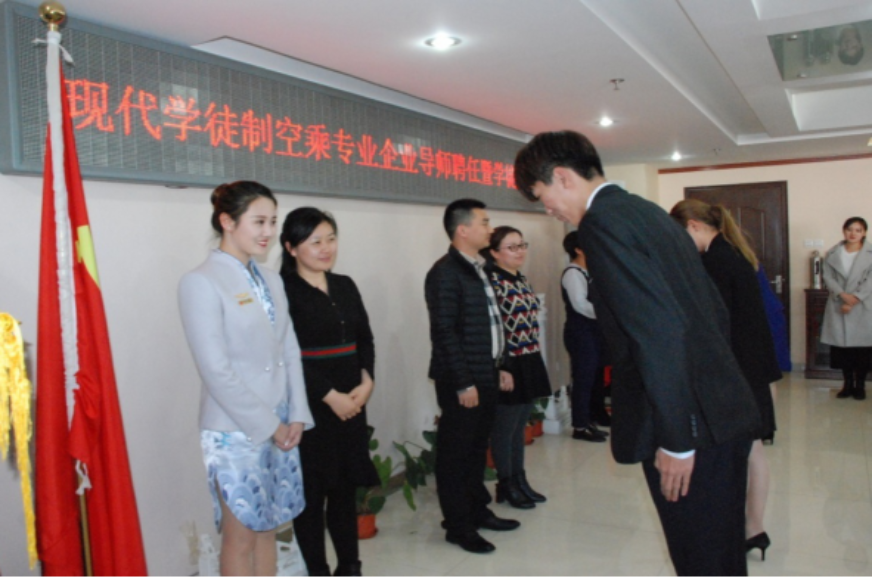学生被现代学徒制试点班录取后,各专业还采用各种方式增加学生对企业的归属感,以使学生在学习过程中更早、更准确的找到自己的发展目标。机电一体化技术专业和空中乘务专业采用“拜师”仪式增进师徒间的距离,加深相互之间的了解。学徒们表示,通过拜师求技,渴望在师傅的精心培养下掌握一技之长,练就精湛技艺,将工匠精神代代传承下去。