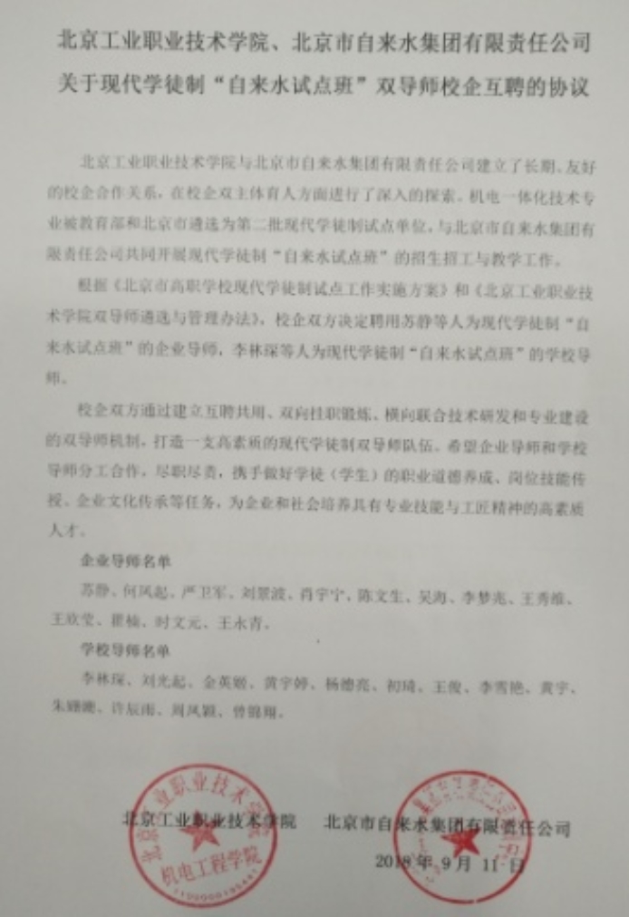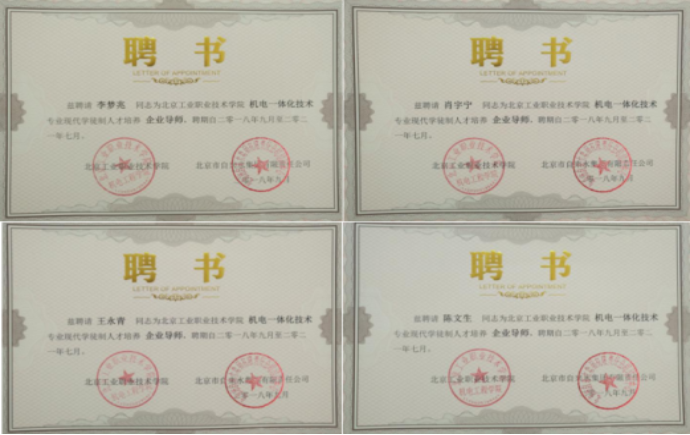 从2017年申报现代学徒制试点项目开始,各试点专业就与合作企业建立了密切的联系,在师资培训、企业实践、科研开发、就业指导等方面都开展了较为深入的合作。学校人事处出台了《北京工业职业技术学院现代学徒制双导师管理暂行办法》,形成了校企互聘共用的管理机制。各试点专业都与合作企业签订了双导师校企互聘协议,组建了双导师团队。