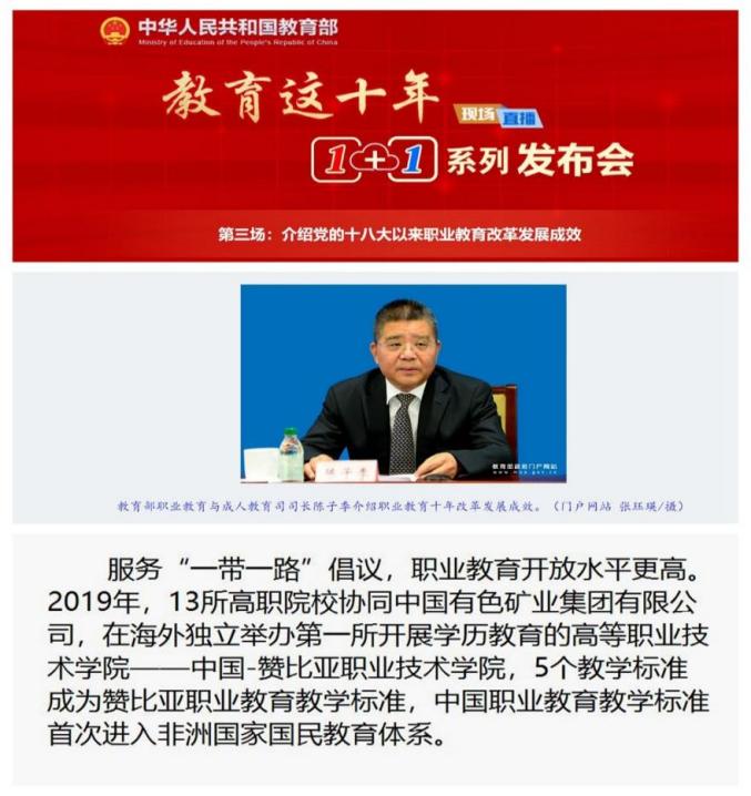 建成中国在海外第一所开展学历教育的职业院校-中赞职业技术学院,闯出四方联动,职业教育“抱团出海”的新路径。独立开发自动化与信息技术和珠宝设计与加工两大专业标准和37项课程标准,被纳入赞比亚国民教育体系并推广应用;选派优秀教师赴赞任教,组织赞方本土教师来华培训;组织专业教师出版职业教育“走出去”系列专业英文教材和工业汉语教材,形成中国标准“走出去”的生动实践。